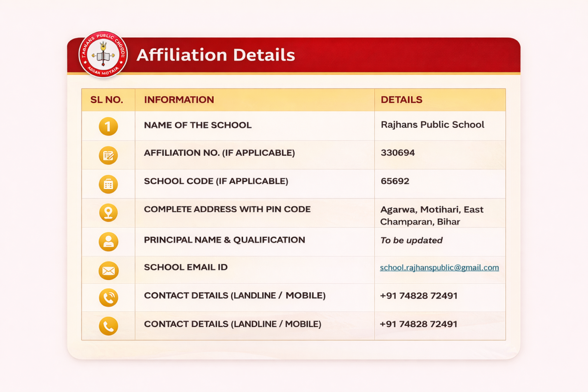 Rajhans Public School is affiliated with the Central Board of Secondary Education (CBSE), New Delhi, and follows the CBSE curriculum and guidelines.